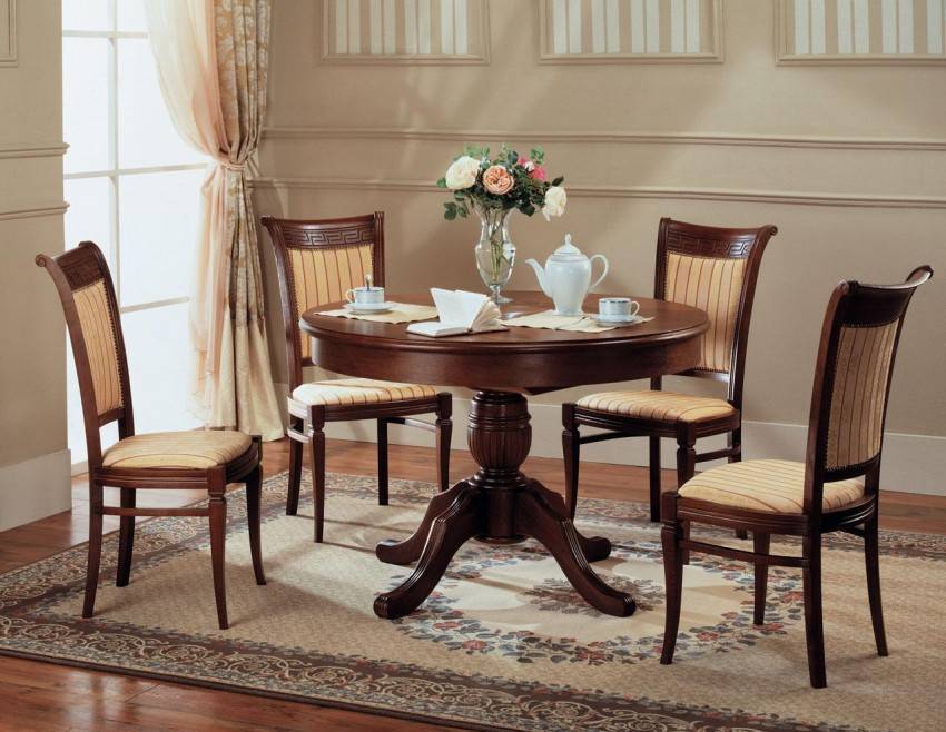 - В классическом интерьере столовой уместными будут богато украшенные деревянные образцы.