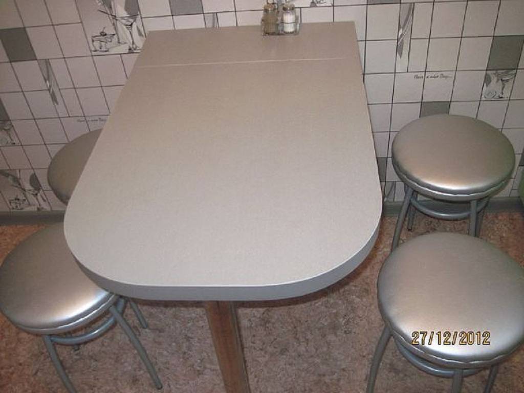 Металлические. Поверхность табуретки (каркас) обработанный хромом способен переносить кухонные условия и выдерживать большие нагрузки. Негативный момент – из-за значительного веса предметы мебели могут испортить напольные покрытия, если не использовать резиновые или пластиковые колпачки;
