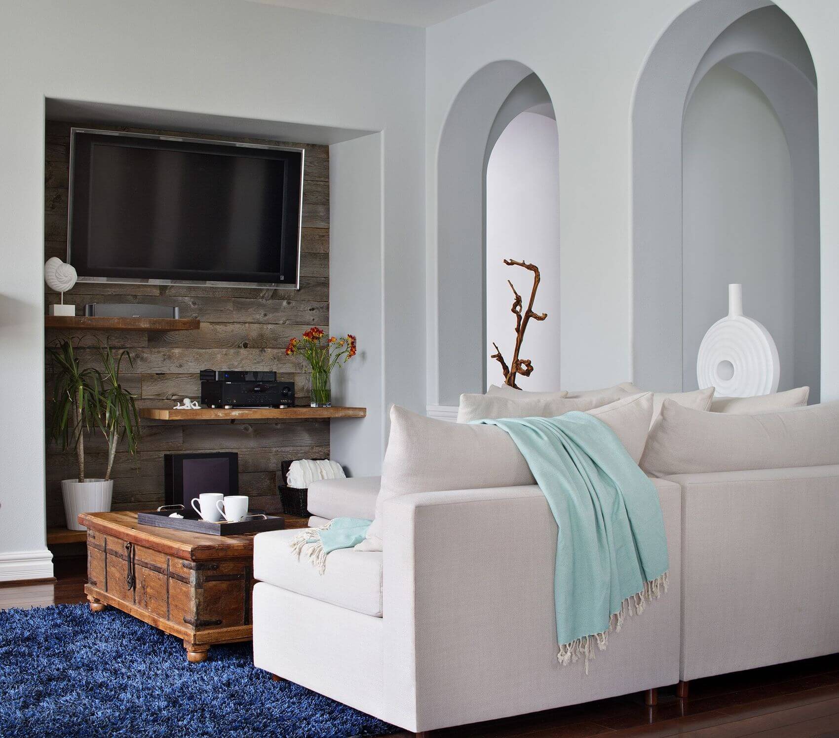 Телевизор прекрасно подходит для декорирования в самых разнообразных стилевых решений, например, модернизм, ретро, морской, шале, шебби-шик и многие другие. Ниже представлены варианты оформления наиболее популярных стилей.