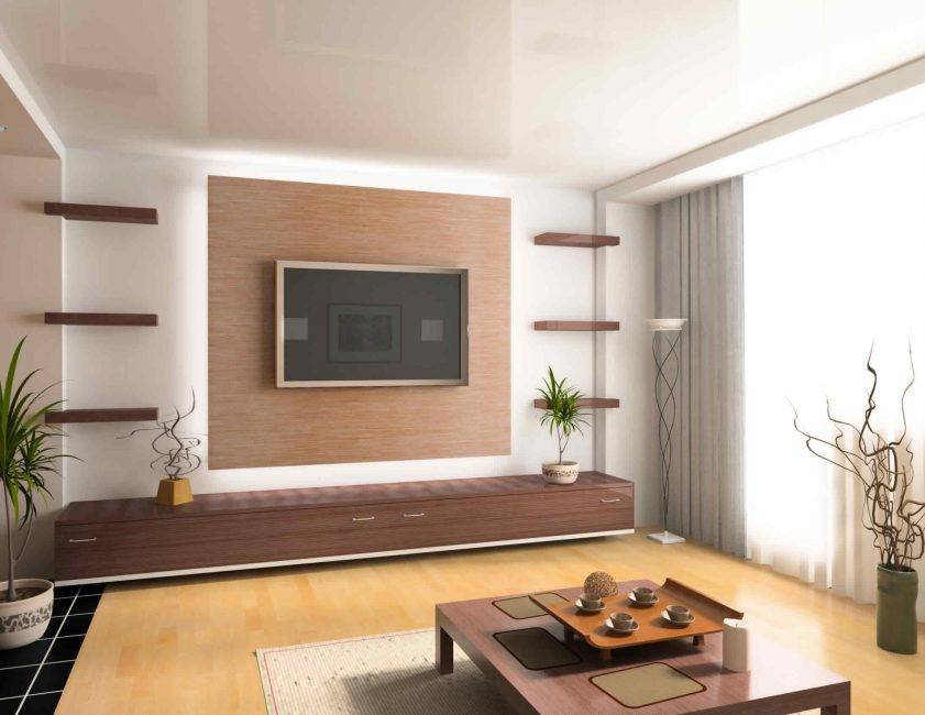 Телевизор в зале можно поставить на стенку или подвесить с помощью специального крепления