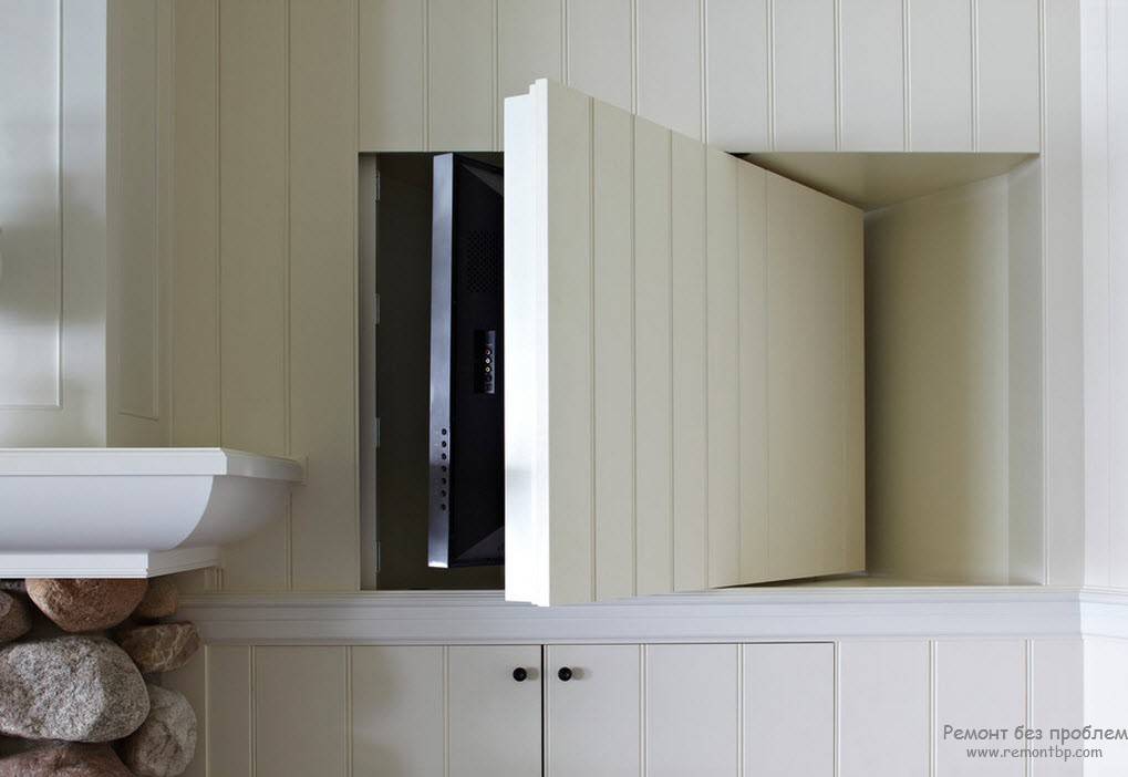 Телевизор можно спрятать за картинами, раздвижными панелями, дверьми шкафов-купе.