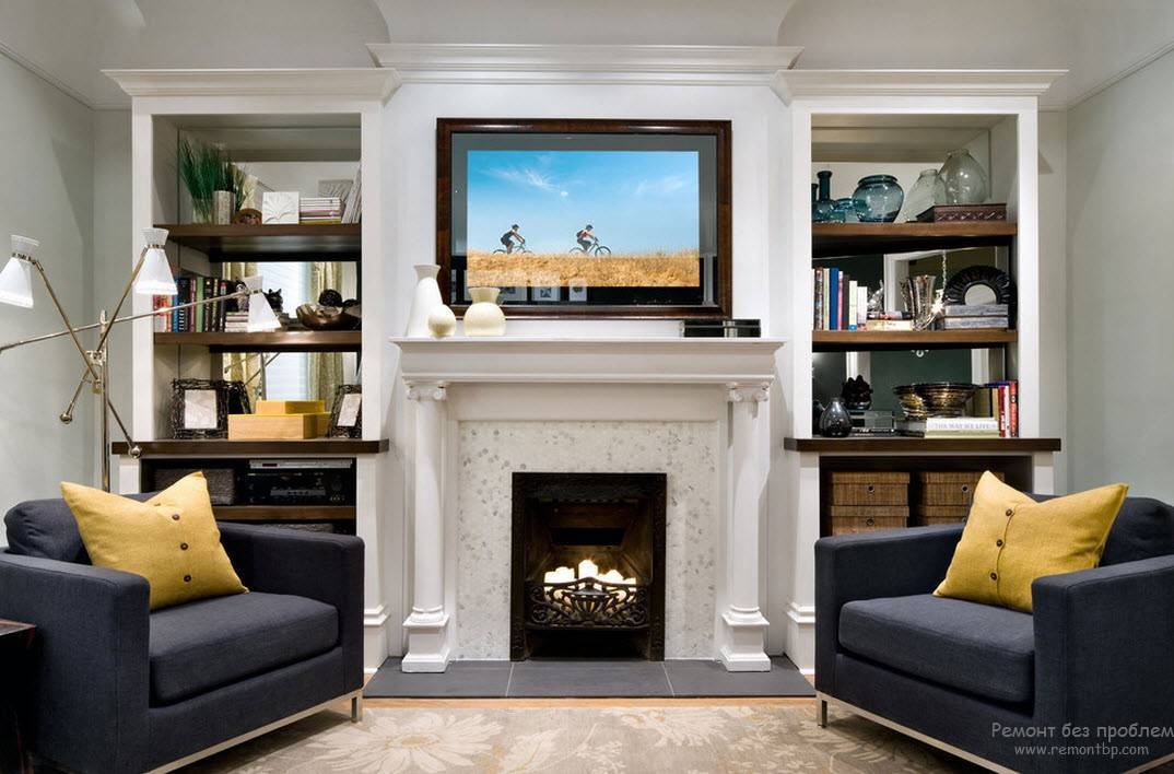 Популярные варианты размещения очага и телевизора в интерьере гостиной: