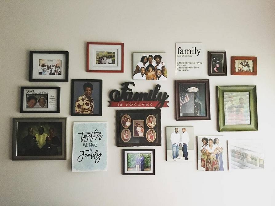 Дерево с фотографиями на ветках ― отличная идея для оформления семейных фото. Ствол с ветвями можно нарисовать самому или воспользоваться виниловыми наклейками.