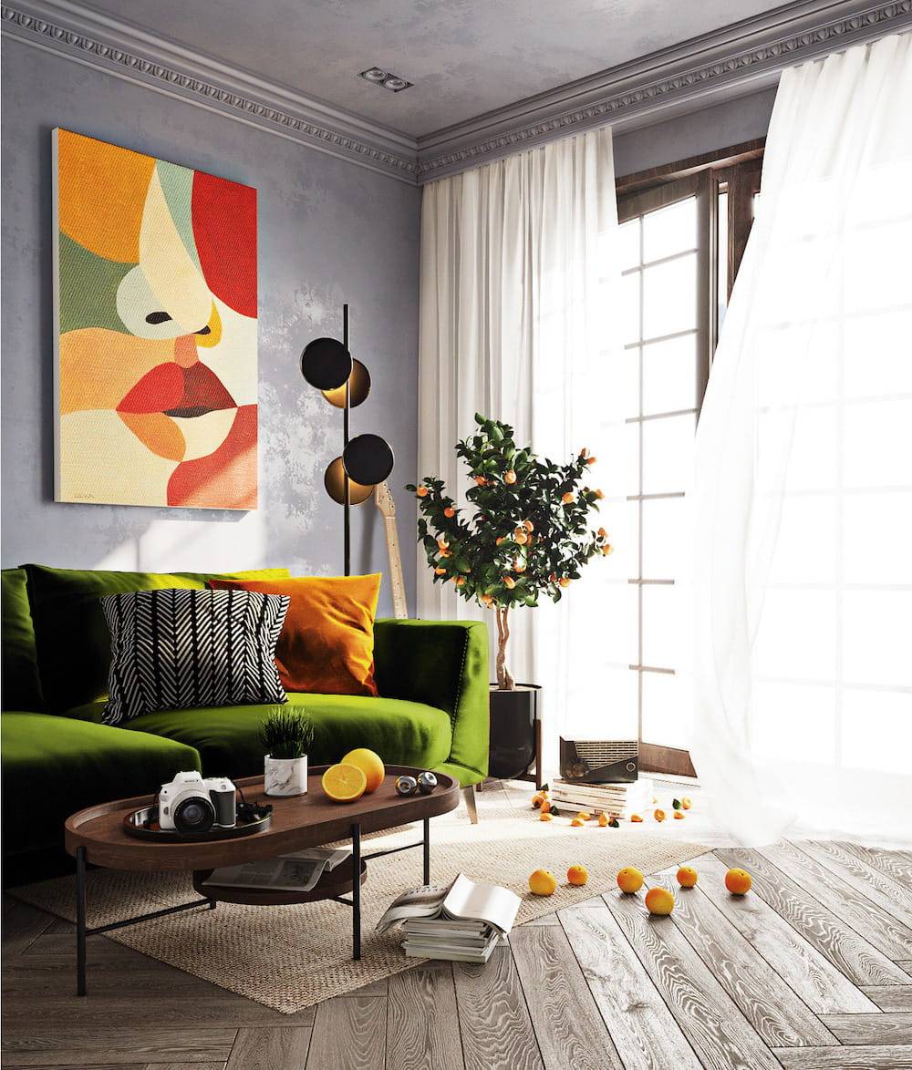 Абстрактные изображения способны приковывать к себе внимание. Хорошо, если этот мотив будет повторяться в текстиле или других декоративных элементах.