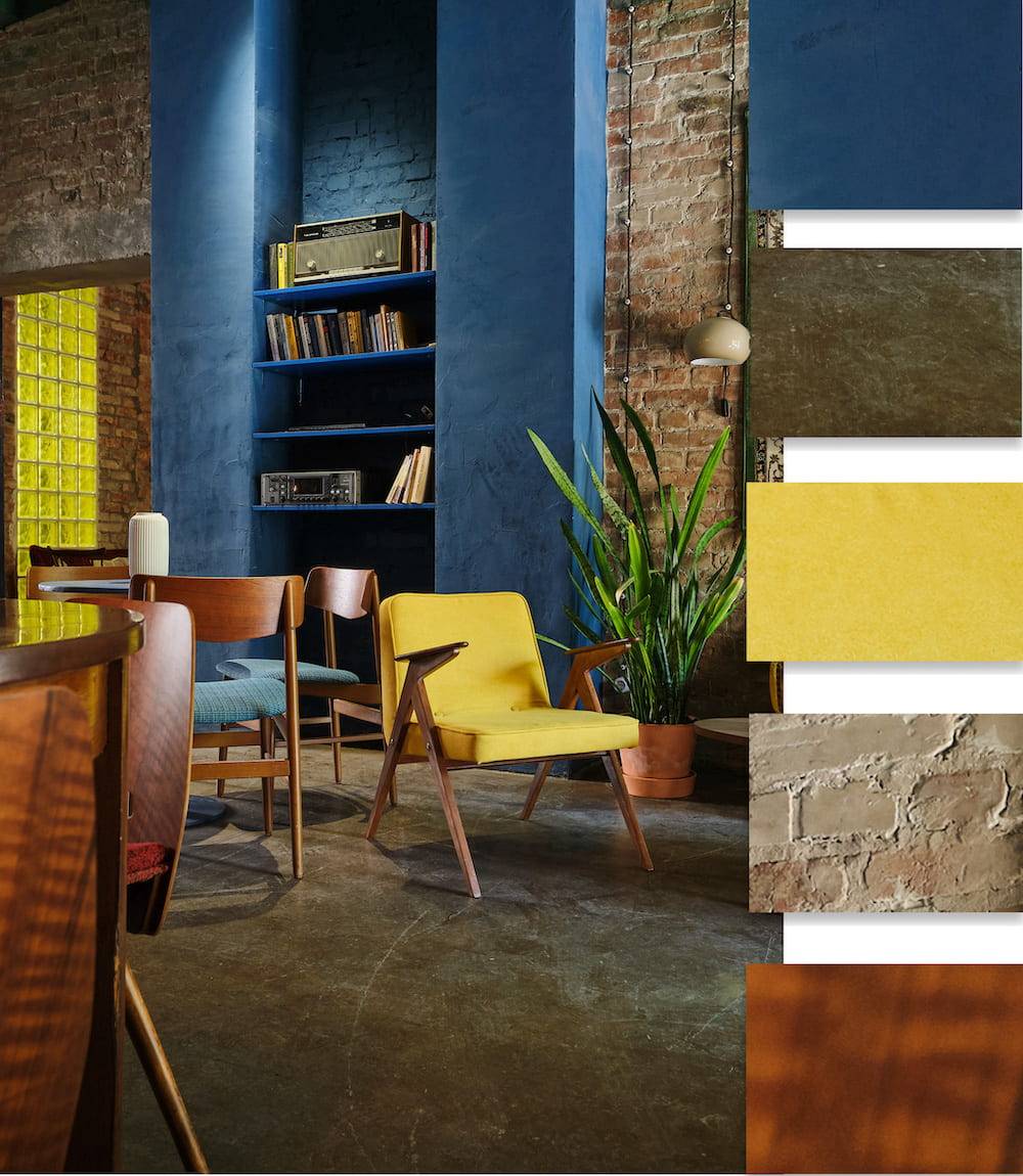 Палитра сделает интерьер комнаты светлой и солнечной. Пестроту канареечного или лимонного фона минимизирует элегантный каштановый. Чтобы пространство не выглядело слишком агрессивным, обязательно используют темные аксессуары. В помещении гармонично смотрится апельсиновая акцентная стена, которую дополняет мебель шоколадного цвета.