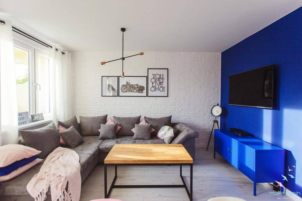 При этом, в отличие от нейтральных оттенков, таких как серый или черный, синий диван в гостиной оживляет интерьер и является интересным акцентом, привлекающим внимание. Более темный оттенок также облегчает уход за этой мягкой мебелью