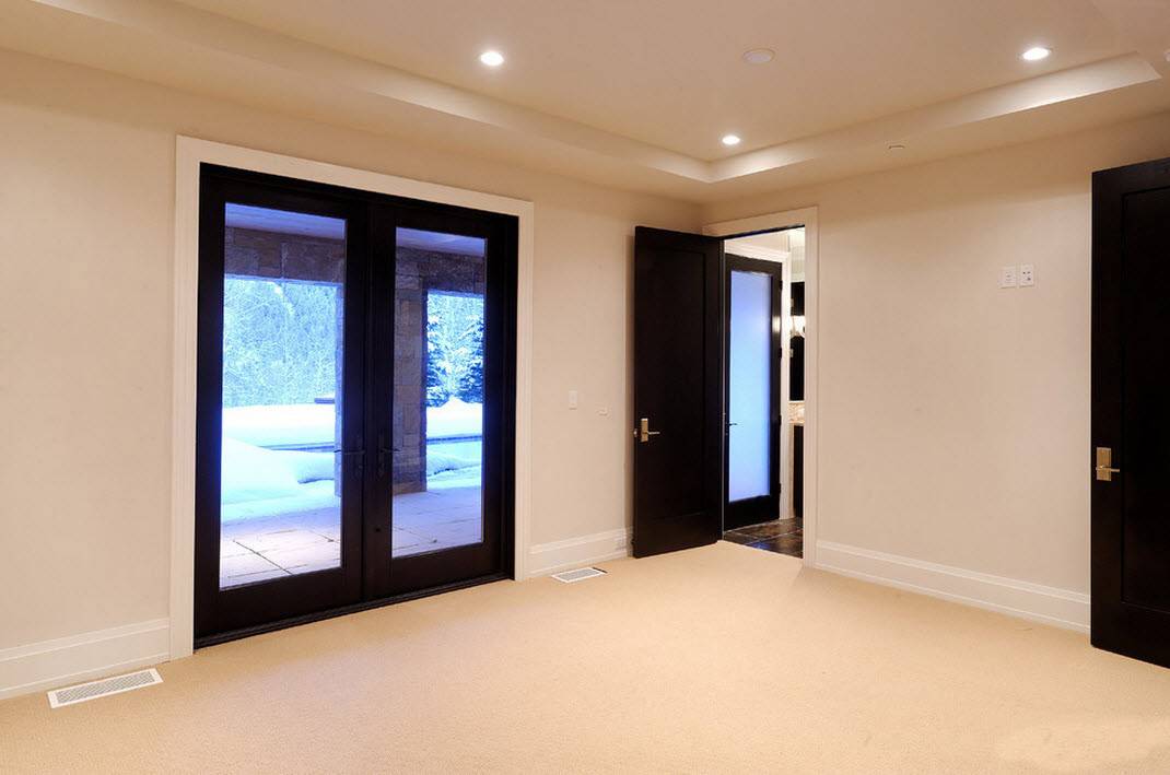 Дизайнерское решение «светлый пол – темные двери» можно назвать смелым и немного дерзким, подходящим только для помещений значительной площади. Основной акцент ставится на темную поверхность дверного полотна и светлые оттенки других элементов интерьера. Если цветовая гамма помещения разнообразна, а отдельные элементы интерьера слишком яркие, то желаемого эффекта добиться будет невозможно — контраста не достичь из-за кажущейся пестроты обстановки.