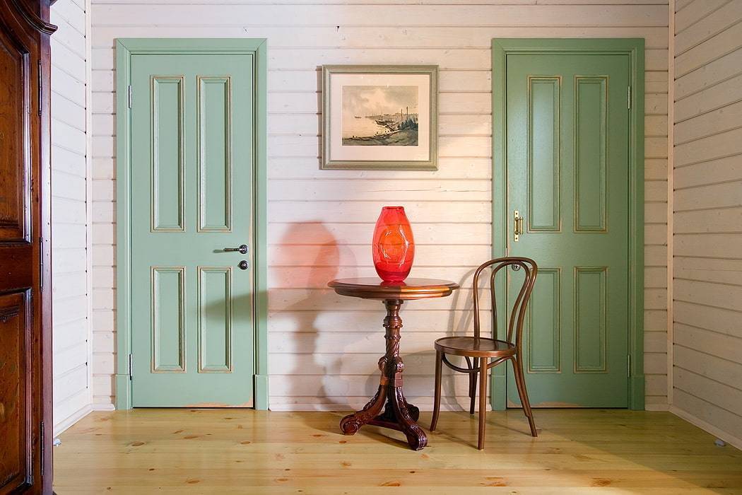 - Зеленые двери сочетаются с темно-коричневым, черным полом и бежевыми, красноватыми стенами.