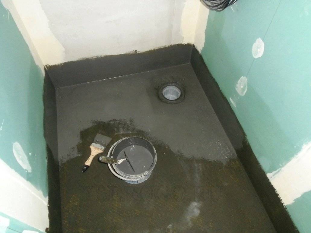 При наличии на стяжке раковин и углублений, поддон можно прошпаклевать плиточным клеем. Это уменьшит расход гидроизоляции и исключит необработанные участки.