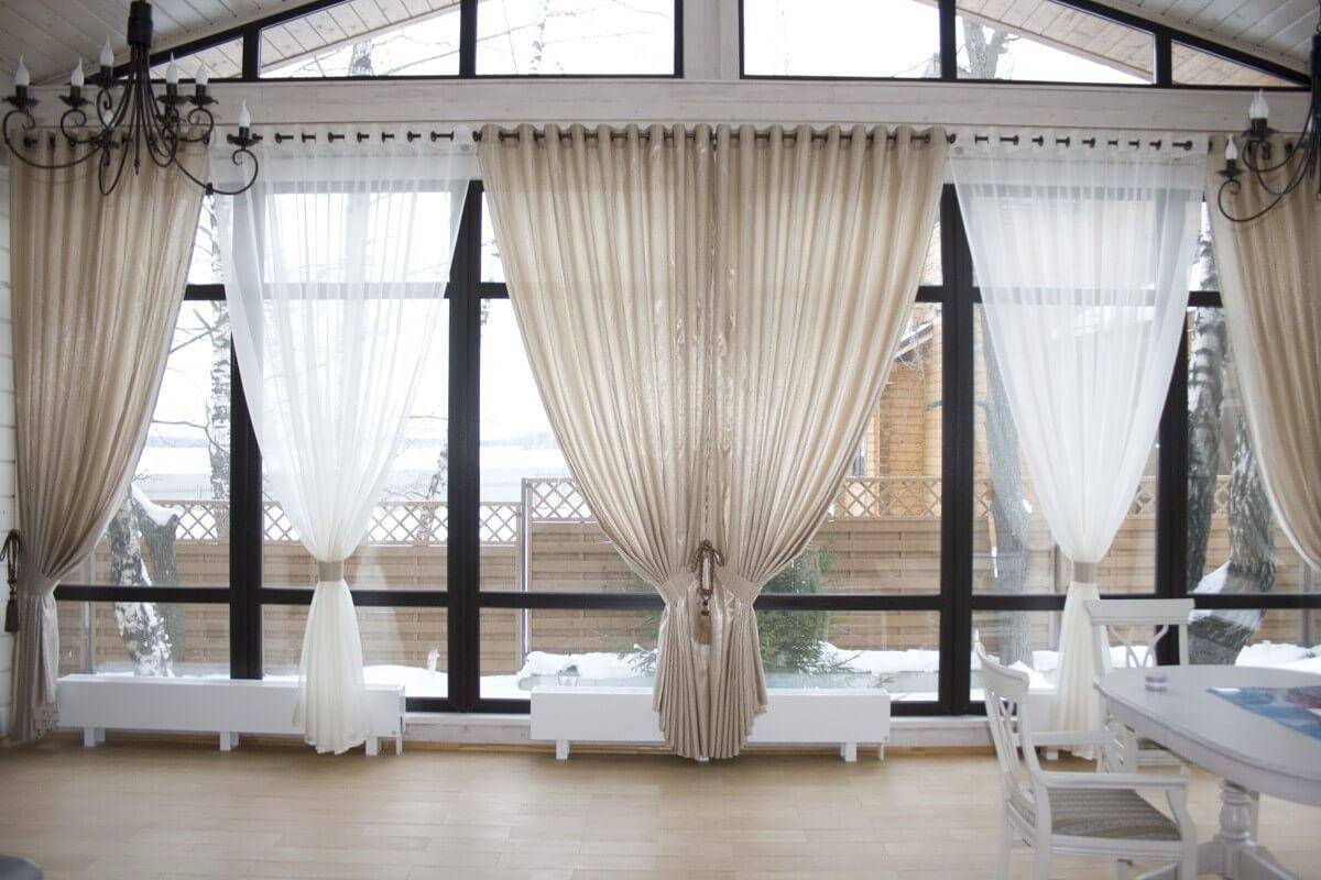 Часто в больших гостиных используют занавеси до пола, многоярусные, а в маленьких помещениях более уместными будут укороченные изделия до подоконника.