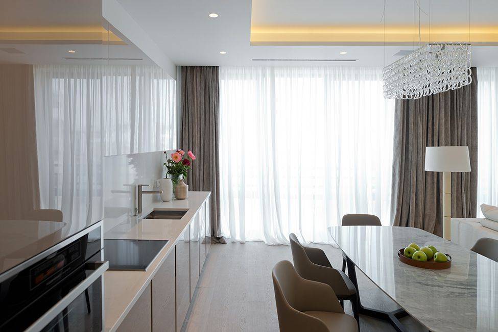 Длинные шторы часто используют для оформления кухни в стиле модерн