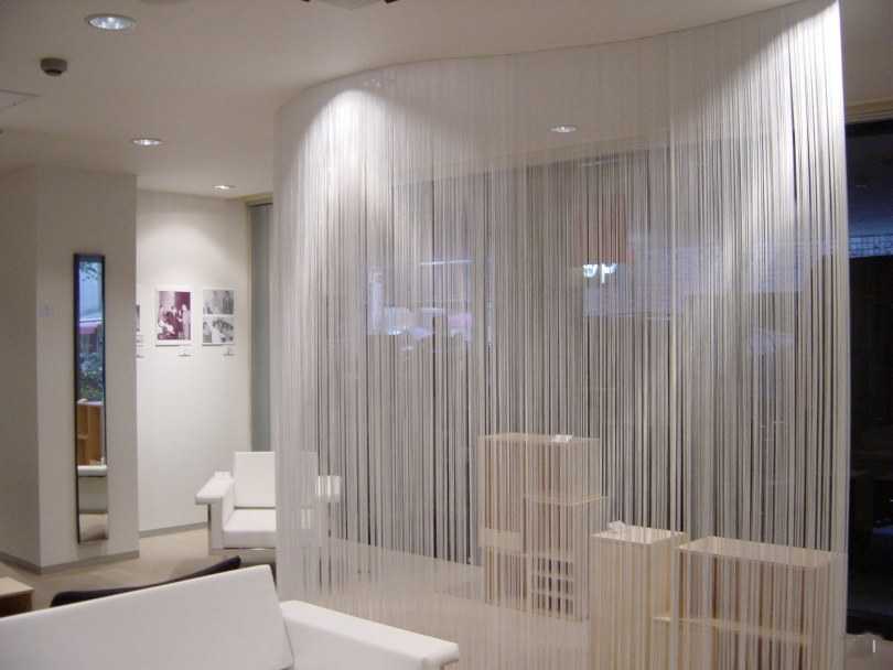 Нити используются как дополнение к основным шторкам – сами по себе совсем не защищают от солнца. Хорошо выглядят нити их двух тонов. Нитями украшают не только окна, но и дверные проемы, арки.