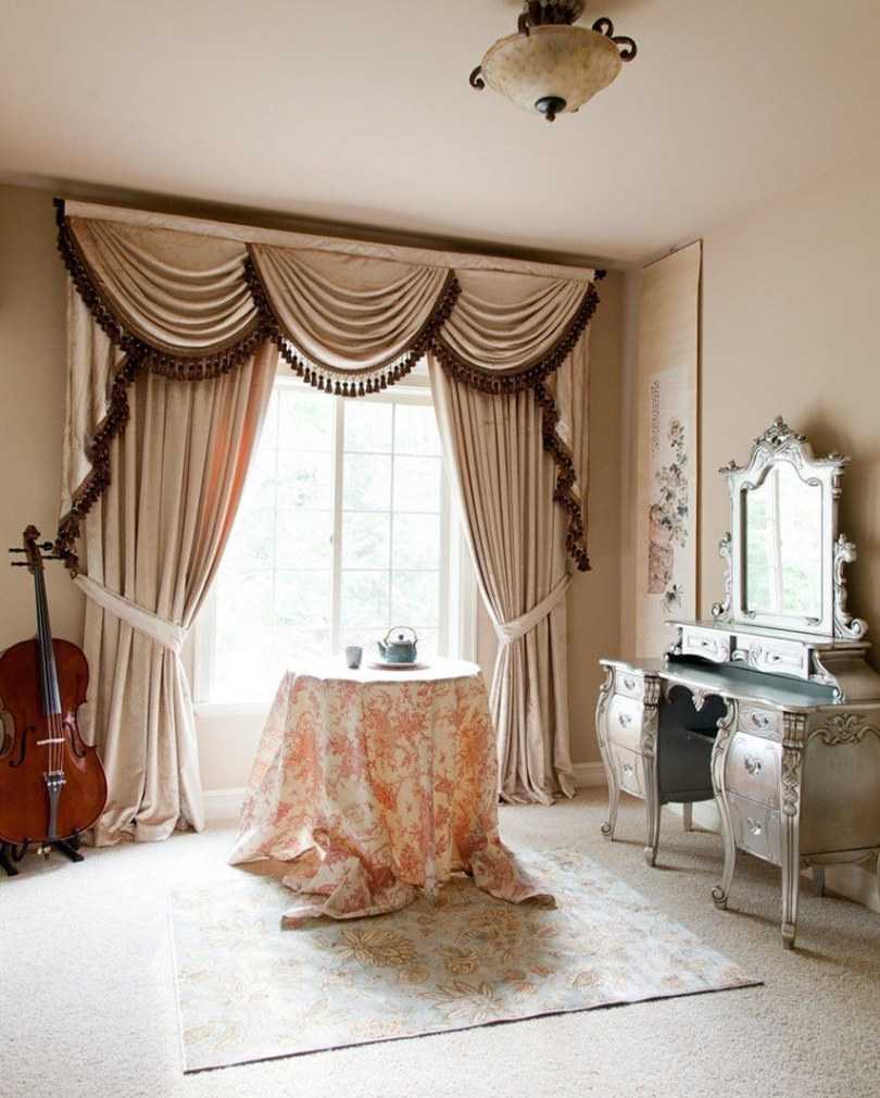 Какие цвета можно сочетать на одном окне при выборе гардин? Шторы из двух цветов ткани шьются как контрастными, так и находятся в одной гамме оттенков. Не рекомендуется использовать контраст классического стиля оформления комнаты.