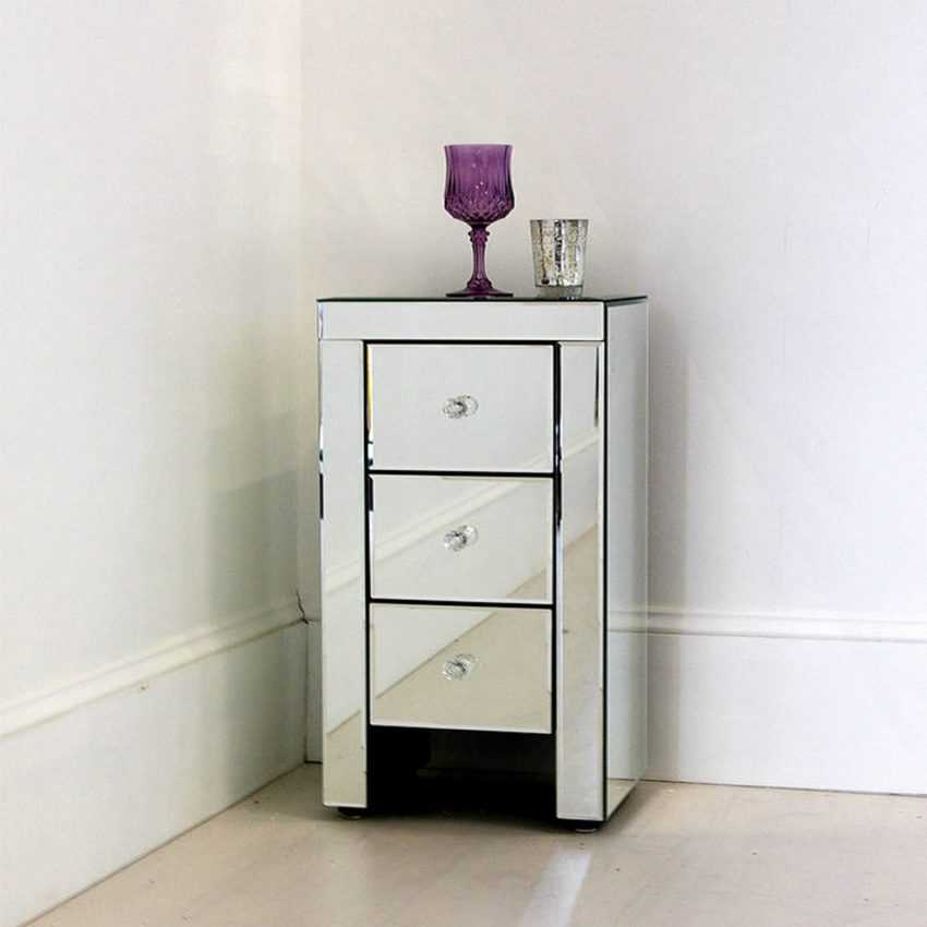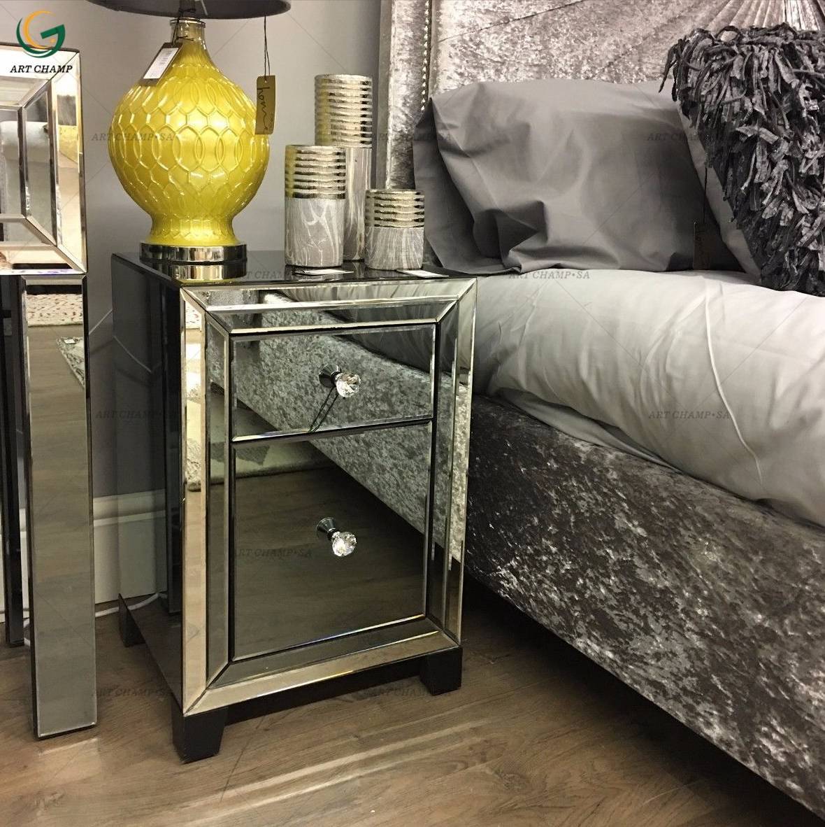 Стеклянные прикроватные модули практичные, невесомые, создают иллюзию простора, идеально подходят для небольших комнат. Они хрупкие на вид, но очень прочные. Прикроватные тумбочки изготавливаются из таких видов зеркал, как матовое, узорчатое, закаленное и так далее. Мебель из этого материала интересно смотрится и без декора, но для придания ей неординарности могут использоваться пескоструйная обработка, фотопечать, витраж, лазерная гравировка.