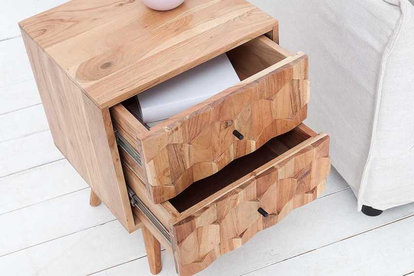 Чаще всего предпочтение отдается именно деревянным изделиям. Прикроватная тумба из массива достойно выглядит, отличается долговечностью и комфортом использования. Кроме того, этот материал экологически чистый, натуральный и прочный. Достойный уход обеспечит сохранение внешнего вида изделия на длительный срок. Массив дерева позволяет изготавливать тумбы всех форм и конструкций. Для декора применяют зеркала, резьбу. Фурнитура для таких моделей используется металлическая различных оттенков. Среди недостатков тумбы из дерева можно выделить высокую стоимость.
