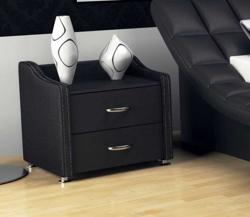 Очень необычно выглядят модели, обтянутые кожей, тканью, мехом. Основанием служит плита ДСП либо МДФ. Прикроватная тумба из экокожи приятна на ощупь, придает интерьеру уют. Этот материал экологичный и долговечный при условии должного отношения, но его легко повредить. Кожаные тумбы могут быть разных оттенков и фактур. Их декорируют крупными стразами, пуговицами, металлической фурнитурой в тон основного материала.