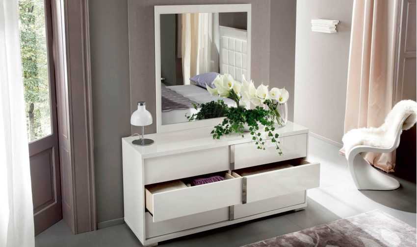 Современный стиль также предполагает, что хорошей идеей будет комод с зеркалом в спальню. Это очень интересный вариант, потому что таким образом удастся получить своеобразный туалетный столик, где можно хранить вещи основного пользования.