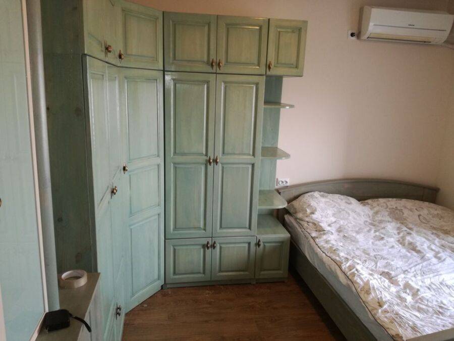 Встроенный шкаф несколько массивно выглядит в комнате с высокими потолками, если, конечно, не снизить его конструкцию, добавив еще один уровень, но это потребует дополнительных средств.