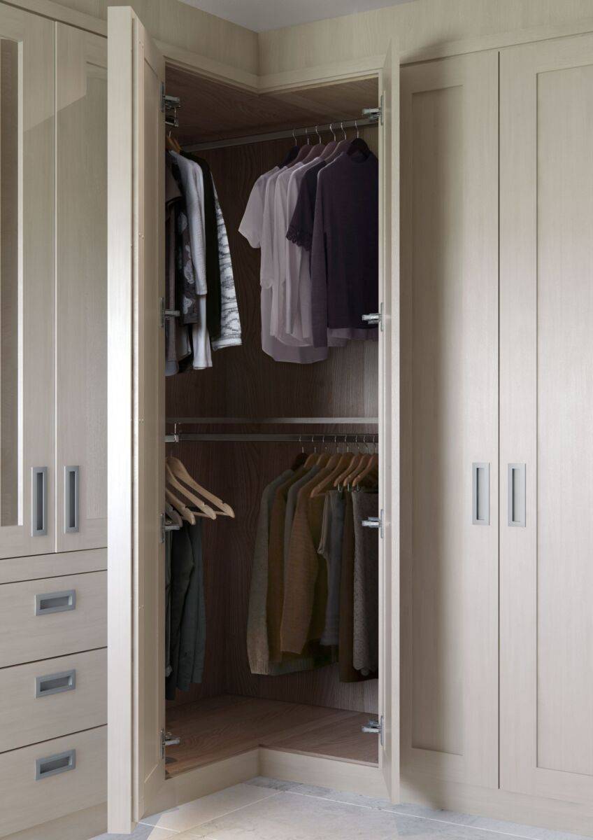 Угловой шкаф распашного типа отлично вписывается в любой дизайнерский проект, а сама система функциональна и надежна.