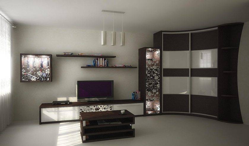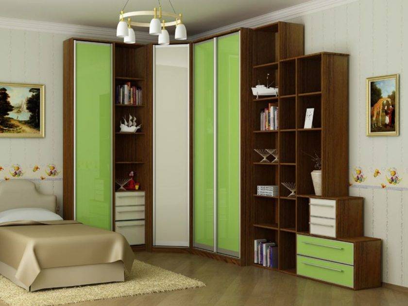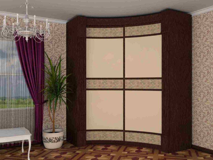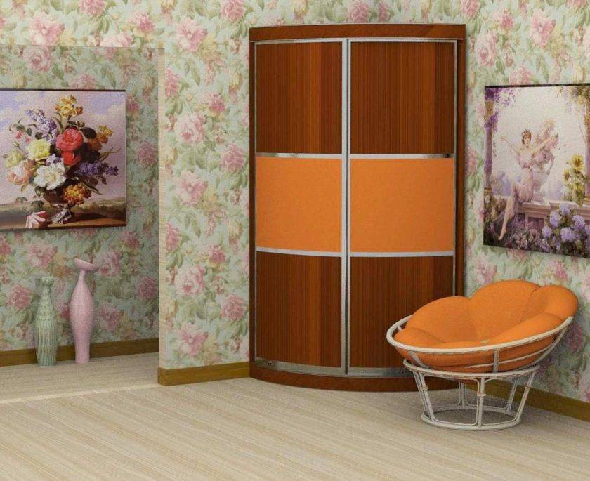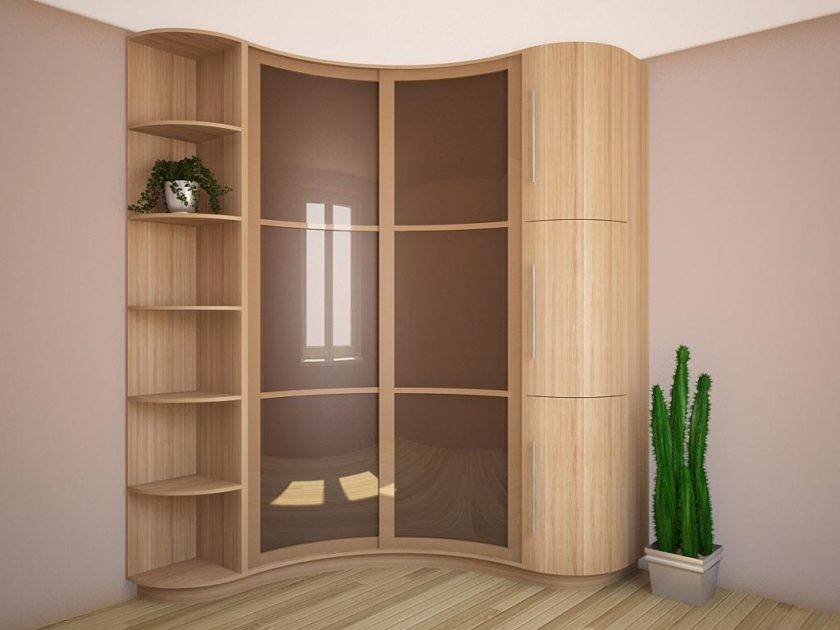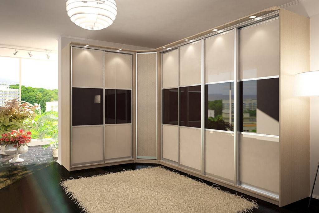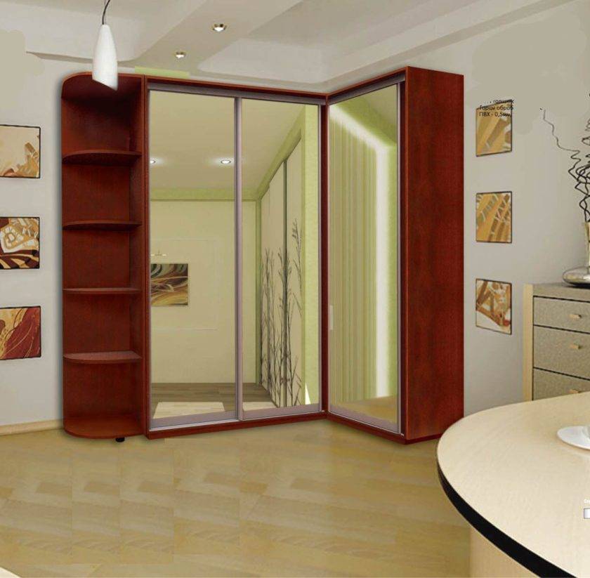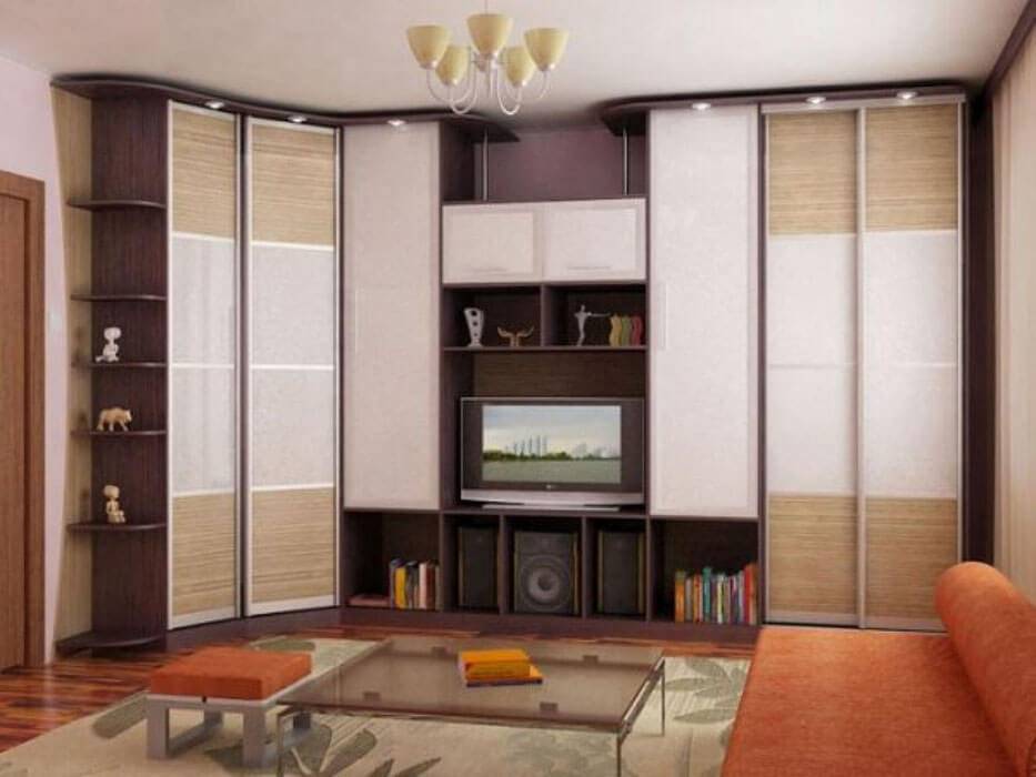 Форма углового шкафа купе в гостиную может быть радиусной, угловой или L-образный.