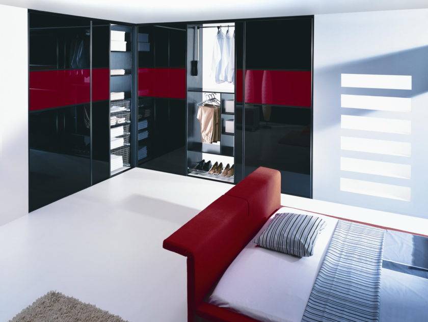 А для комнат с маленькой площадью лучше выбрать L-образный шкаф, который займет стену, станет вместительным местом для хранения вещей и при этом визуально не будет выделяться в маленьком помещении.