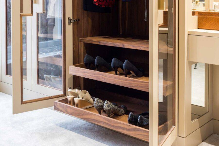 - Выдвижных ящиков для хранения аксессуаров, мелких предметов гардероба, нижнего белья. Желательно оснащать их доводчиками, обеспечивающими плавное закрывание.