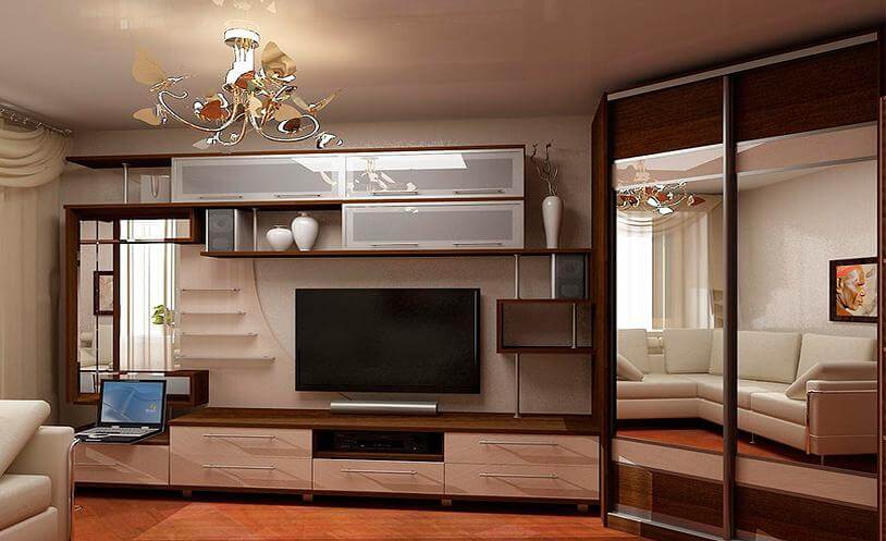 В маленькой гостиной стоит поставить шкаф-купе с зеркалами. Это придаст просторности и освещенности комнаты.