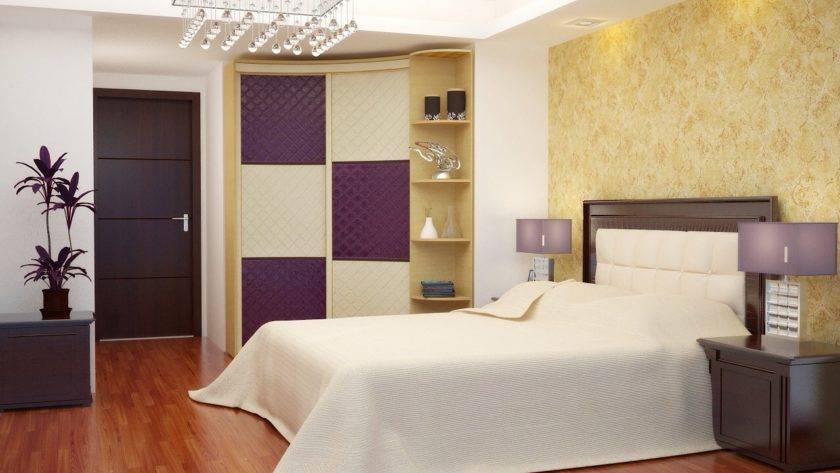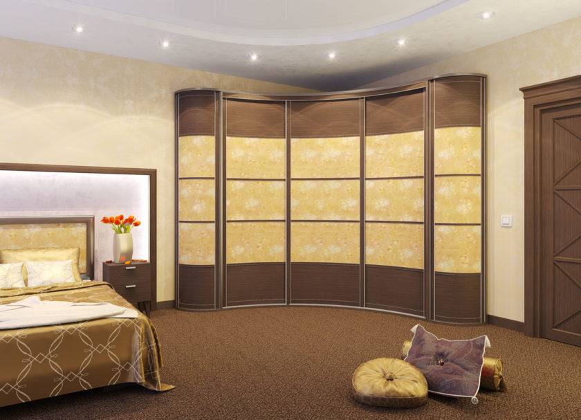 Спальня. В спальную комнату стоит выбирать светлые или зеркальные угловые шкафы-купе, радиусного исполнения. Такой подход создаст романтику и позволит расширить пространство.