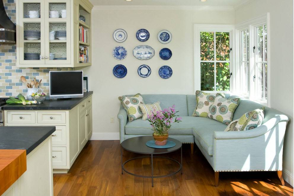 Размещение дивана на кухне зависит от ее формы и планировки. Чаще диванчики здесь являются разделителями отдельных функциональных зон. Ими отделяют обеденную зону от места отдыха, располагая вдоль стены. В широких комнатах устанавливают модели углового типа со столами, обустраивая с их помощью комфортные столовые уголки.