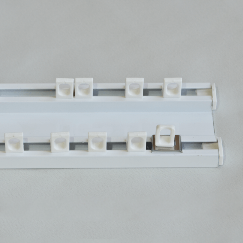 Пластиковые модели являются разновидностью профильных вариантов, имеют лёгкий вес, привлекательный внешний вид и демократичную цену. По форме они напоминают плоский профиль (шина) с 2-мя, 3-мя, а иногда и 4-мя пазами для крючков. Шинный или реечный вариант, как правило, крепится к потолку.