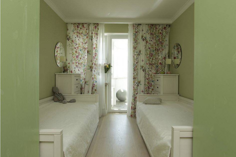 На пол в вытянутой детской комнате рекомендуют стелить ковер с поперченными полосами, тогда помещение зрительно будет шире. Желательно, чтобы арочный проем был как можно выше. На нем соорудить маленькие полки, на которых расставить игрушки. На окна повесить занавески под цвет стен, это могут быть римские или рулонные.
