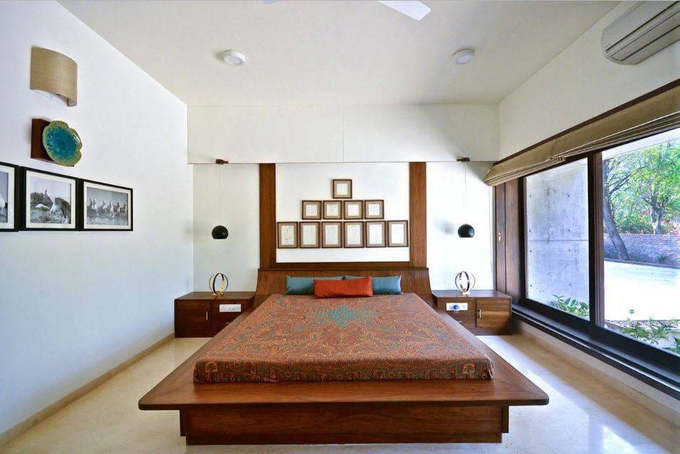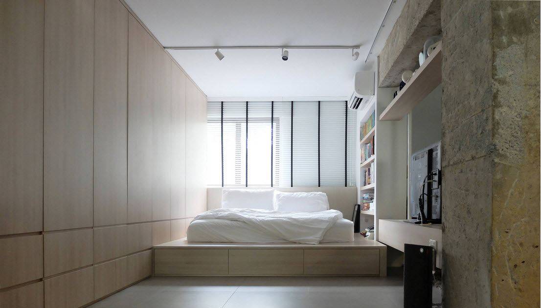 Кровать может быть установлена на специальном подиуме, который, кроме эстетической функции, может выполнять практическую роль шкафа для хранения нужных вещей.