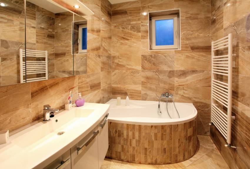 Во избежание эффекта «коридора», узкое помещение можно разбить на зоны: рядом с унитазом и/или раковиной уложить мелкую мозаику, а вдоль ванны — более крупные элементы похожей расцветки, или наоборот. Плитку лучше выбирать квадратную, 6- или 8-угольную.