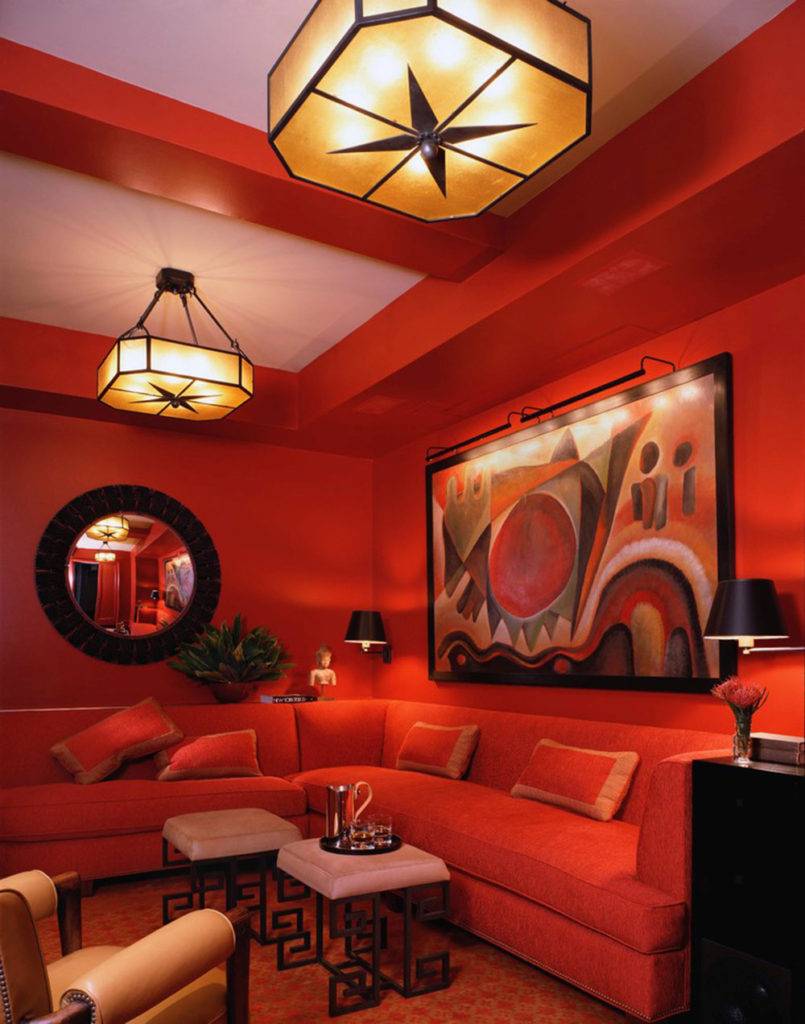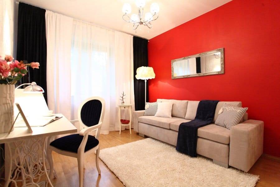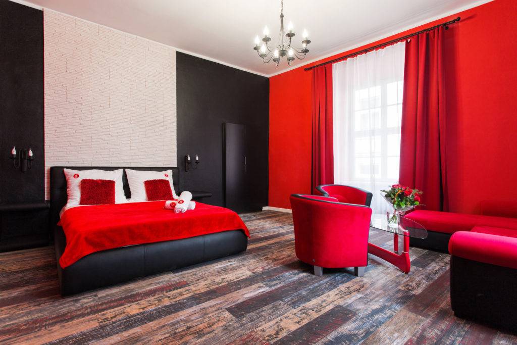 Сочетание агрессивного яркого красного прекрасно смотрится с чёрным, белым, серым и жёлтым.