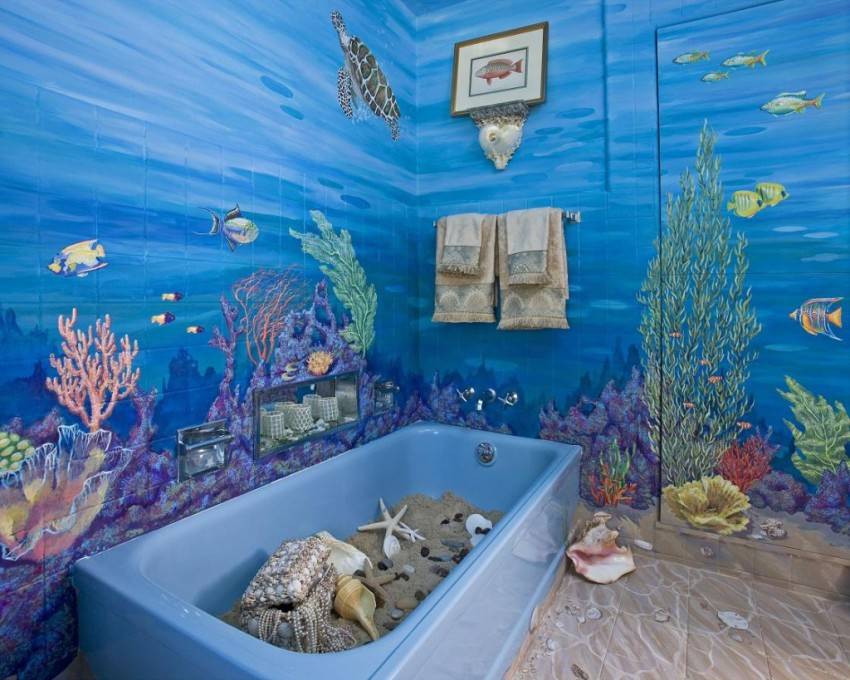 Очень привлекательно выглядит мозаичная плитка в стиле морских историй. Ею можно выложить и стены и пол, составляя из различных цветов морские картины.