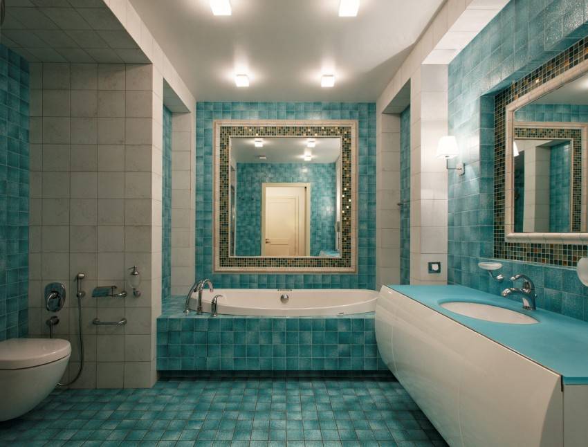 Зеркала. Выглядят необычно, усиливая эффект освещенности в ванной. Однако уход за зеркалами на потолке труден, да и монтаж такой конструкции довольно дорог.