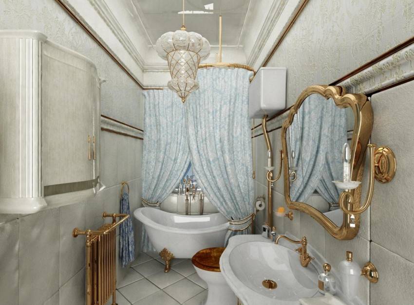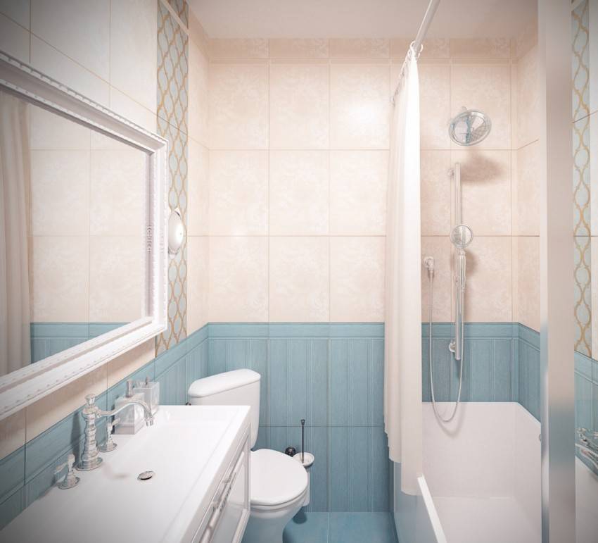 Стиль барокко можно выгодно подчеркнуть декором-лепниной. А вот унитаз, ванну и раковину можно выбрать в кремовых оттенках. Душевая кабина в такой стиль не впишется. - Не менее популярен дизайн ванной комнаты в синих токах. Проект морской тематики всегда актуален. Крупная кафельная плитка синих цветов хорошо сочетается с бежевой мозаикой. Можно и наоборот разбавить светлый кафель синими оттенками. Такое решение заметно углубит пространство маленького помещения.