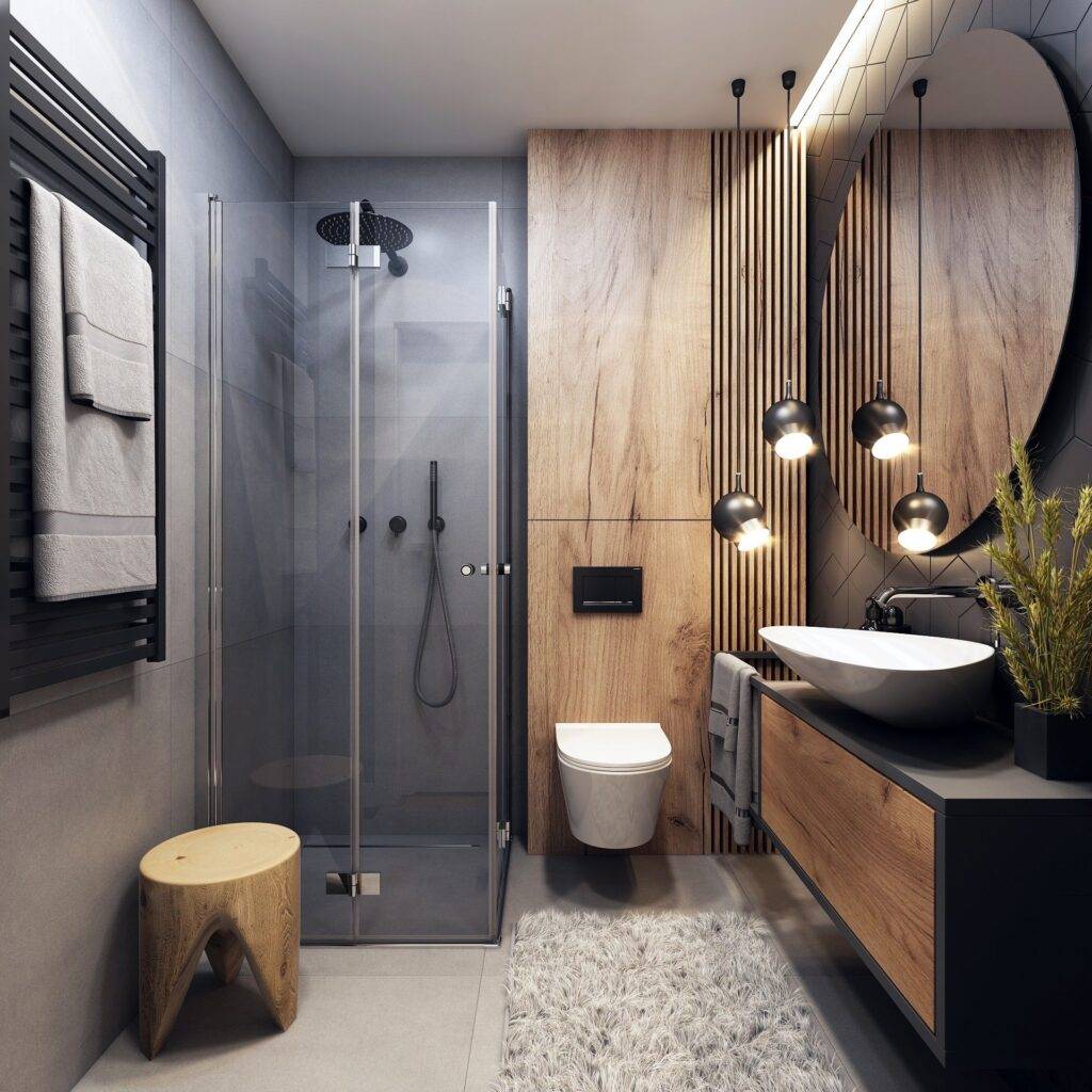 В современной банной зоне душевая кабина отвечает за функциональный аспект пространства, прозрачная стенка которой усиливает впечатление простора и точно вписывается в стиль минималистского дизайна. Можно поставить душ без поддона, оснащенного линейным сливом, установленным на полу или стене. Хорошим вариантом будет выбор плоских поддонов или монтаж на уровне с плиткой, создавая однородную поверхность с полом. Декоративное сохранение направления может относиться не столько к модным каютам, сколько к их отделке. Внутри могут быть представлены интересные решения. Выразительный черный цвет профилей или обогащенный минималистскими акцентами в виде стильных ручек. Ванная комната с душем не означает отказ от ванны. Достаточно того, что любители длинных ванн будут использовать оригинальные ширмы, благодаря которым стильная сантехника будет менять предназначение: сегодня она станет чашей для расслабляющего купания, а завтра превратиться в заряжающий энергией душ после тренировки благодаря освежающему потоку.