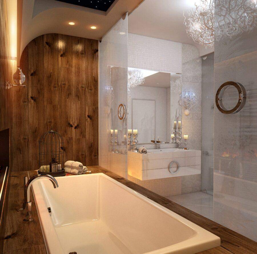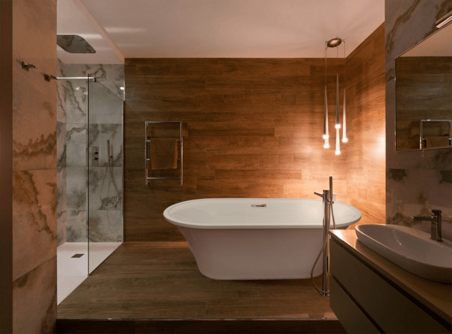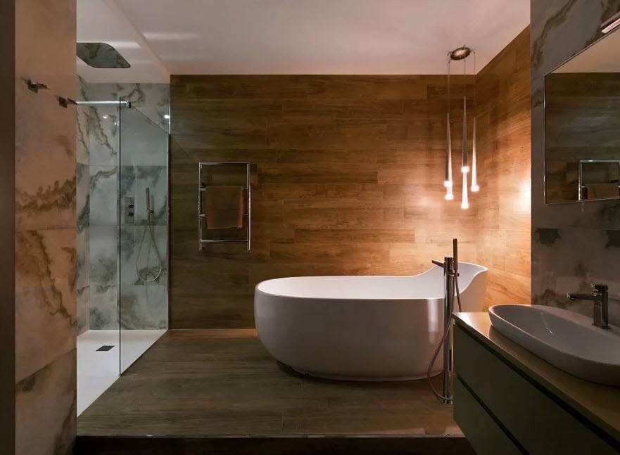 Интересный способ придать ванной комнате характер — покрыть чашу для купания различными отделочными материалами: деревом, плиткой, имитирующей натуральное сырье, такое как камень, шпон или бетон. Как правило, выбор падает на керамическую плитку, поверхность которой легко моется, устойчива к влаге и частому контакту с водой, а также не создает проблем при эксплуатации