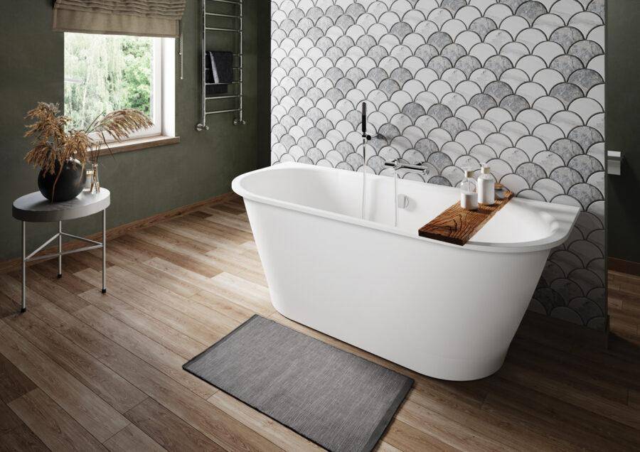 Однако, когда вы хотите немного согреть декор и обратить внимание на ванну, стоит украсить сантехнику эффектной мозаикой или 3D-плиткой. Также хорошо повторить этот мотив в пространстве рядом с зеркалом или сверху сантехники, чтобы сделать интерьер сплоченным