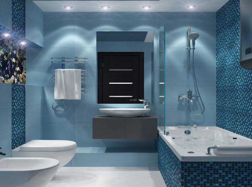 Синий цвет и его оттенки помогут в создании ванной комнаты, выполненной в морском (средиземноморском) стиле.