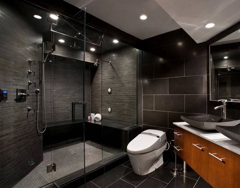 Черный цвет – идеальное решение для большой ванной комнаты. Чтобы помещение не казалось мрачным нужно позаботиться о сложной и многоуровневой системе освещения.