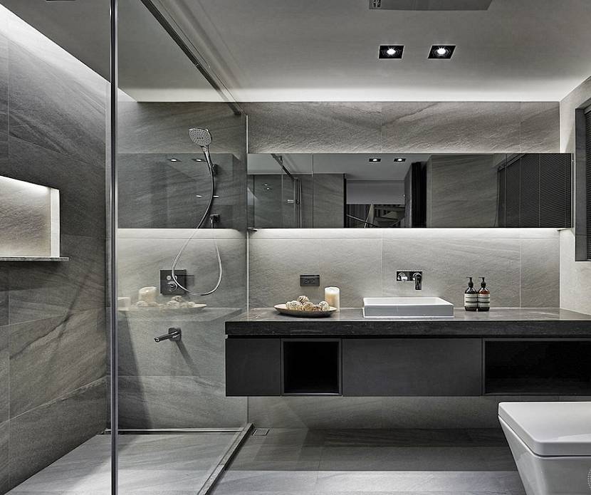 Отделка ванных комнат плиткой одного цвета, но с максимальными фактурными сочетаниями зрительно увеличит пространство