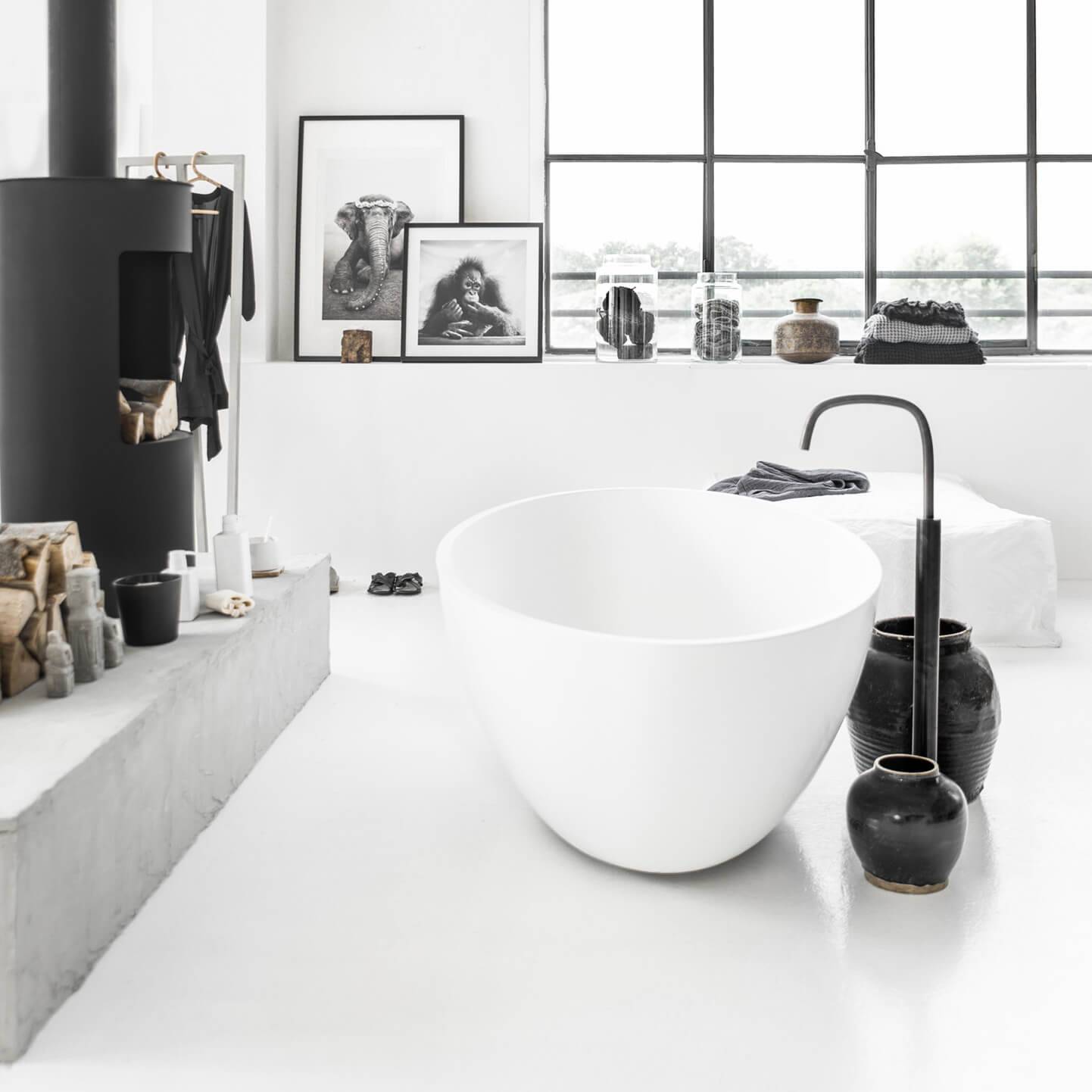 Белые стены и черный пол – очень популярный тандем, имеющий много сторонников и почитателей. Такое сочетание весьма типично и традиционно для скандинавского стиля в интерьере ванной комнаты. Белые стены могут быть оформлены как плиткой, так и штукатуркой, покрытой специальной краской.