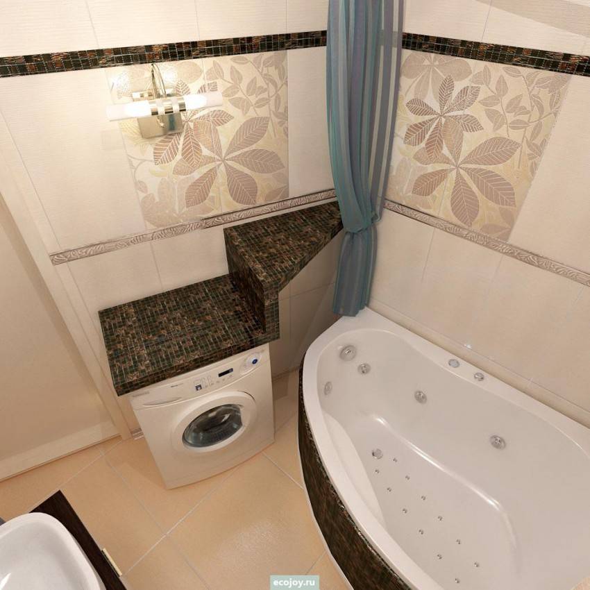Стиральную машину рекомендуется размещать не возле ванны, а под умывальником или столешницей с ним. Такая расстановка потребует специальной раковины без сифона снизу, но зато техника не будет занимать драгоценные квадраты у стены. Также машинку можно вынести вовсе из санузла. В дизайне кухни или коридора она будет смотреться несколько неорганично, но при умелом обыгрыше все возможно.