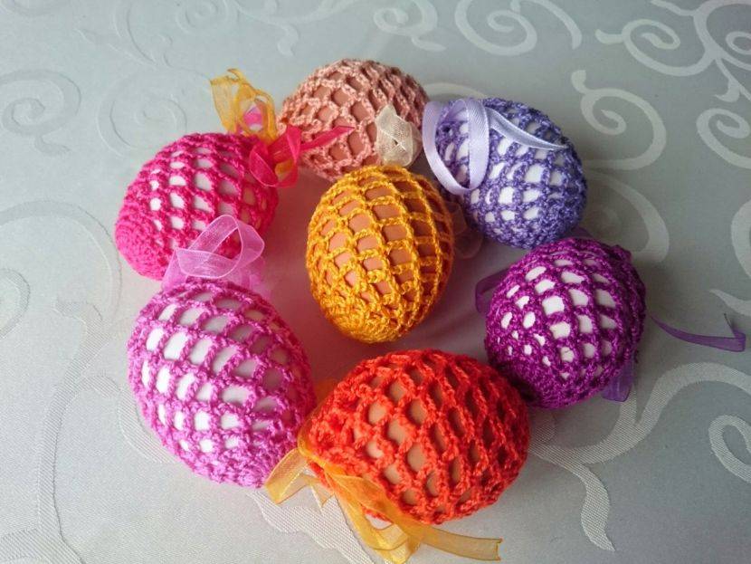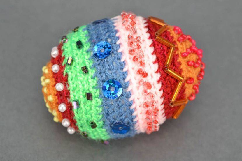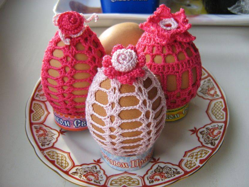 Для создания изделия понадобится крючок для мелкой вязки и нитки. Также для декора можно взять ленту, бусинки или стразы. Перед началом работы, нужно измерять каким размером должен быть чехол. Для этого потребуется яйцо. Берем пряжу и крючок начинаем вязать кольцо (в него должно свободного входить большое яйцо). После кольца столбиками начинаем создавать узор (схемы можно найти в интернете).