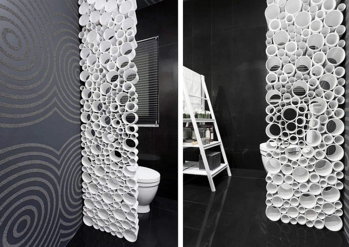 Помогут кольца, нарезанные из подходящих пластиковых труб, сделать невероятно удобную ажурную комнатную перегородку, в которую при желании можно поместить небольшие вещи.