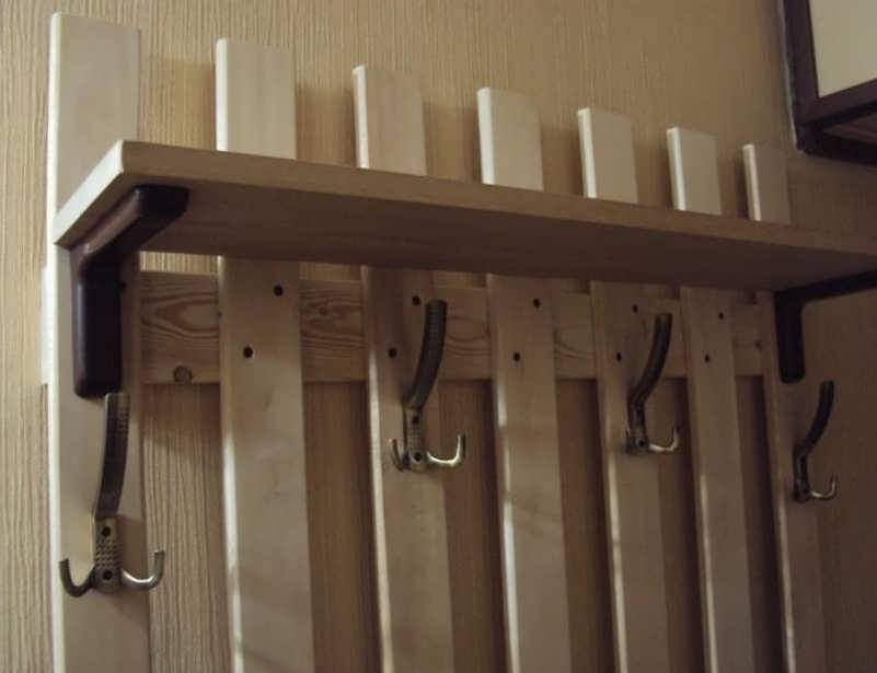 Данный элемент является обязательным для использования в прихожей. Поэтому изготовить этот предмет мебели можно из дерева, а можно взять ДСП, чтобы сэкономить. Необходим минимум инструментов, среди которых шуруповерт, сверла, дрель, карандаш и рулетка, а также крючки для одежды.