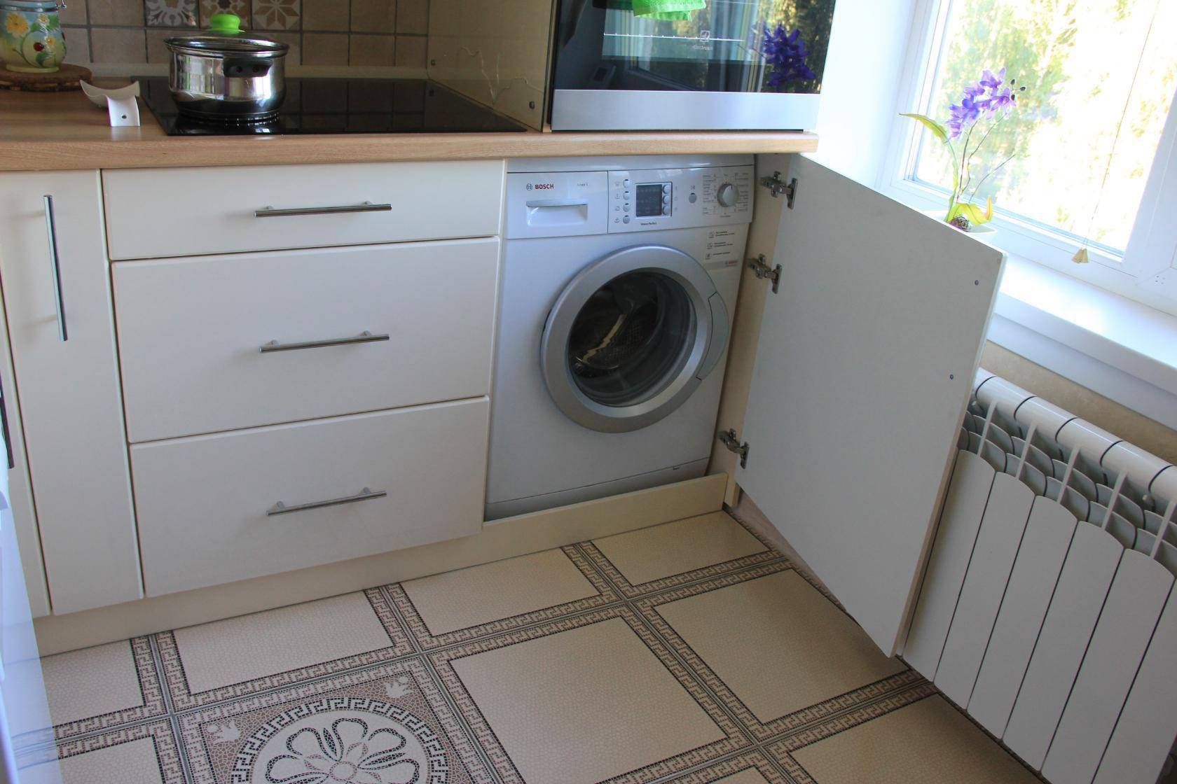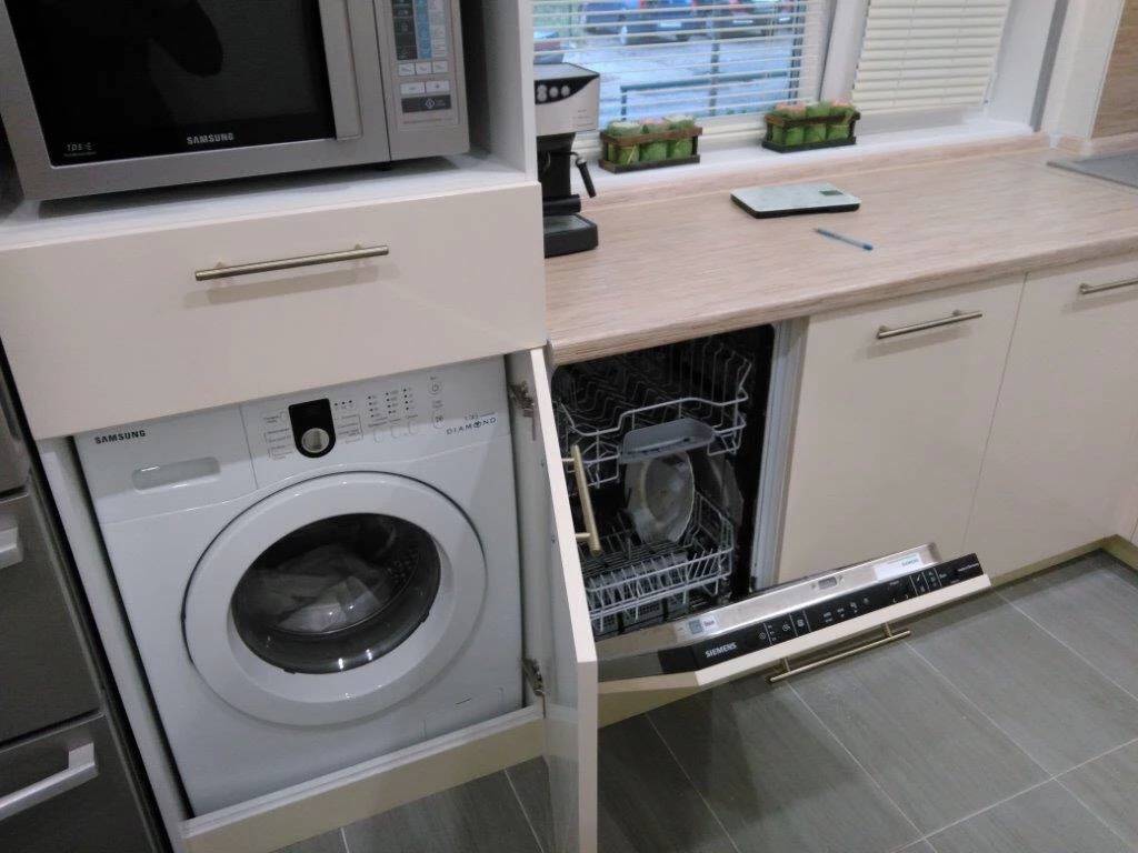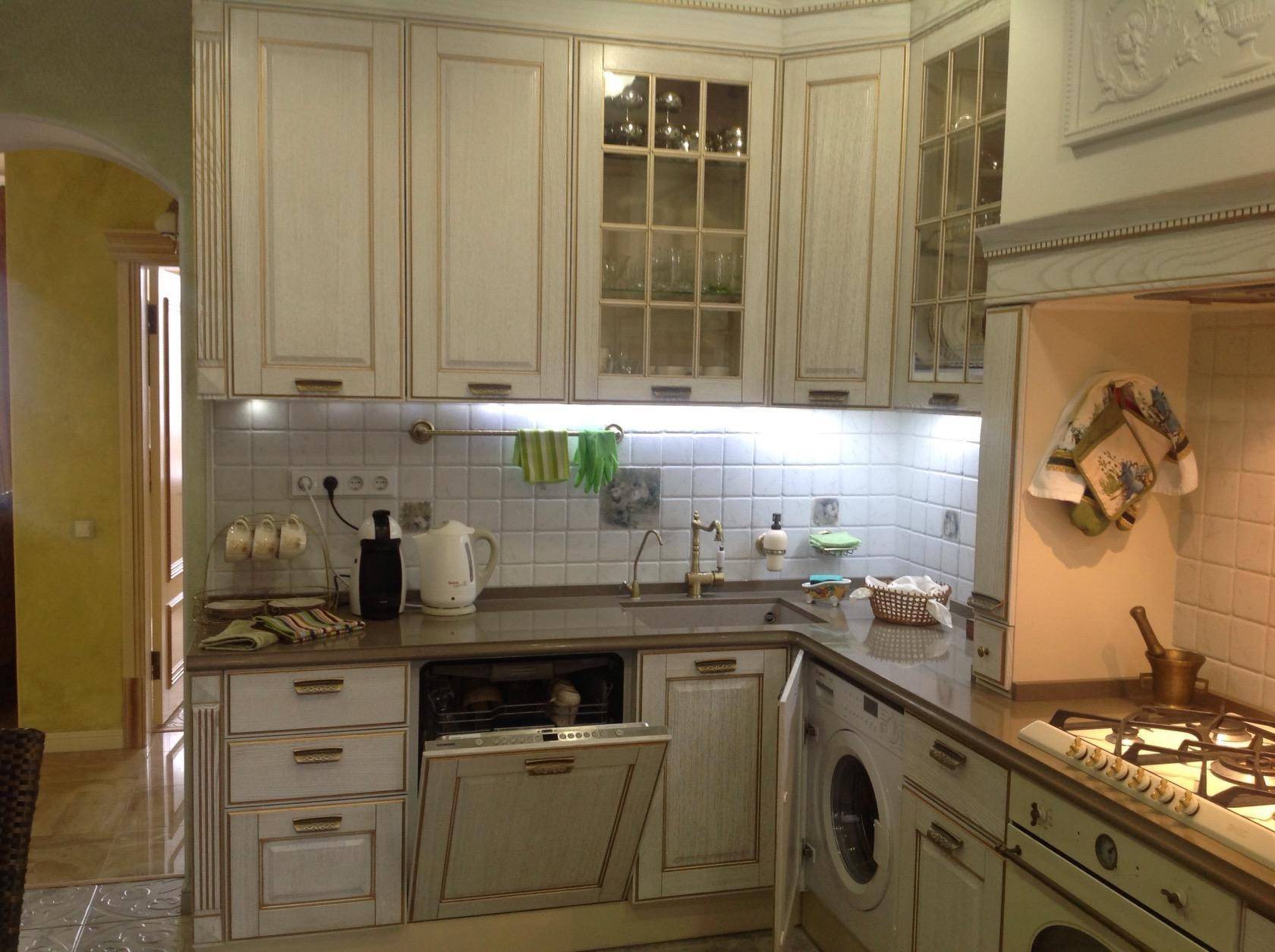 Большинство объектов можно с успехом «спрятать» в самом кухонном гарнитуре: узкие встраиваемые печи, посудомоечные машины. Вместо печи можно приобрести варочную панель, а под ней организовать ящик для хранения кухонной утвари.