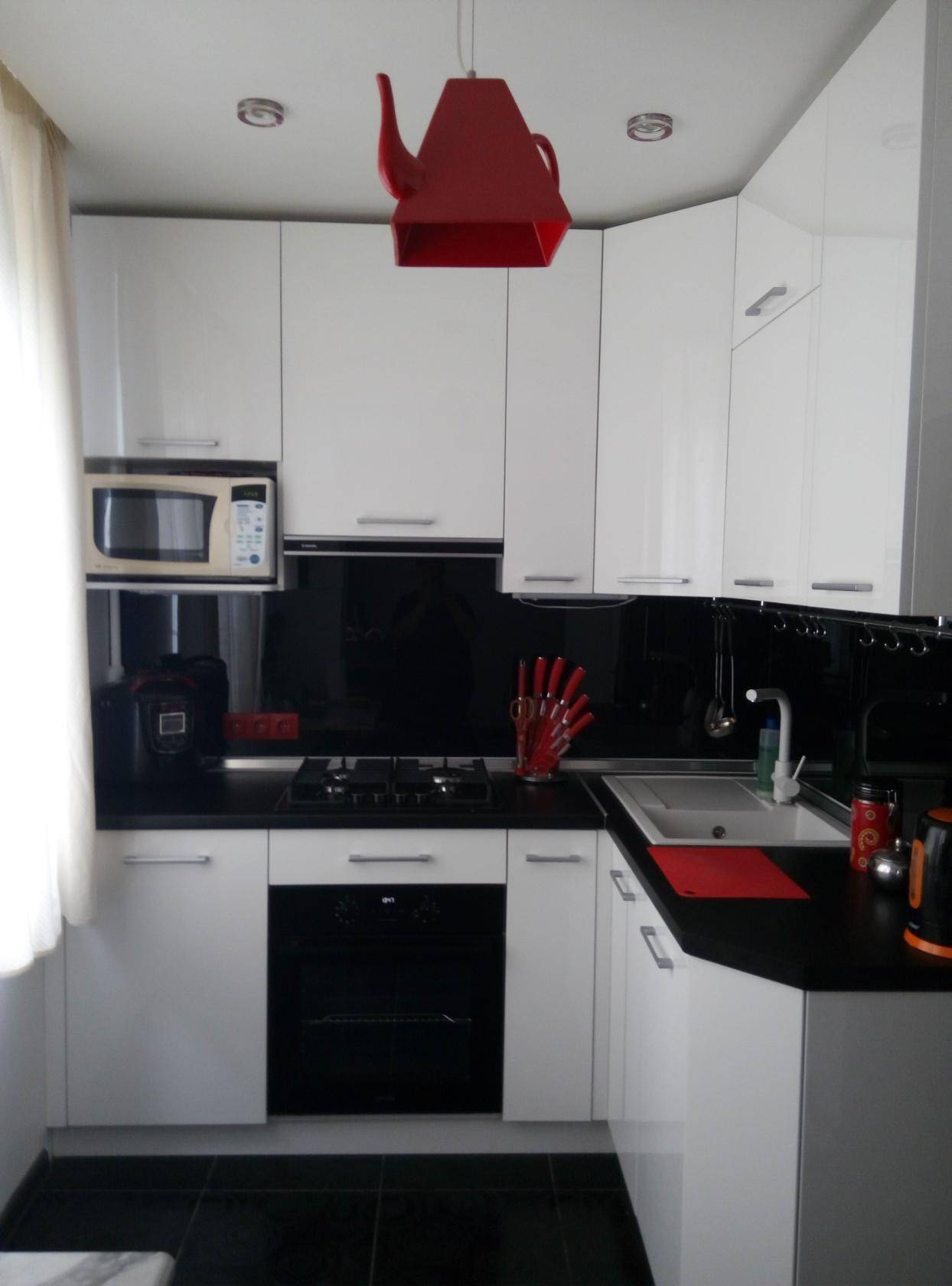 В кухне должно быть как можно больше светлых оттенков в сочетании с яркими или темными акцентами. Самые лучшие цвета для маленького кухонного гарнитура считаются: белый, бежевый, ваниль, светлое дерево, светло голубой.